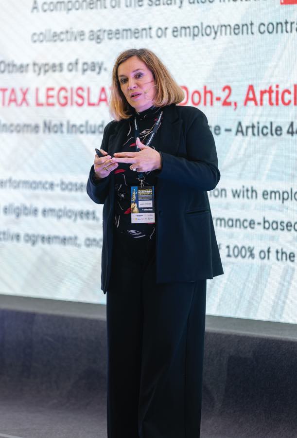 Dr. Mojca Gornjak, direktorica financijsko-računovodstvenog sektora u Andersen Slovenija, govorila je o vrućoj temi oporezivanja isplate poslovne uspješnosti u Sloveniji. “Prema Zakonu o dohotku, poslovna uspješnost može se isplatiti i u naturi, dakle i u plemenitim kovinama.”