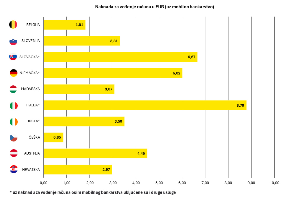 Analizirajući javno dostupne podatke na internetskim stranicama banaka, istraživanje je pokazalo kako je prosječan iznos naknade za vođenje računa, u koju je uključena i naknadu za mobilno bankarstvo, u Hrvatskoj među najjeftinijima i iznosi 2,97 eura. Naknada za istu uslugu, primjerice u Austriji, iznosi 4,49 eura, dok je u Mađarskoj 3,07 eura te u Sloveniji 3,31 eura. Među analiziranim zemljama za navedenu uslugu najmanji iznos plaćaju korisnici u Češkoj i to 0,85 eura.