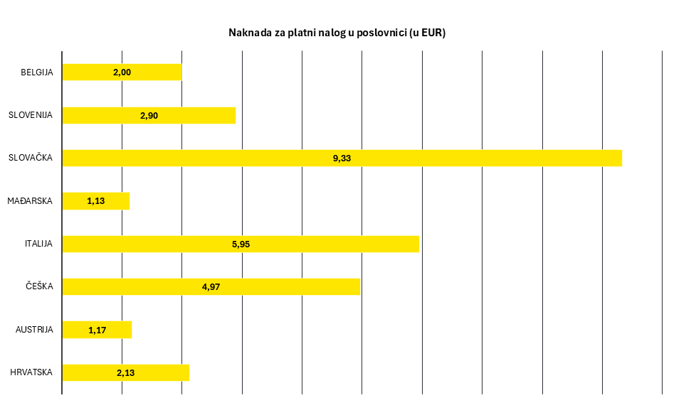 Prosječan iznos članarine po kreditnoj kartici u Hrvatskoj je među nižima i iznosi 1,94 eura, dok je primjerice u Češkoj 2,11 eura, u Irskoj 2,50 eura, u Njemačkoj 2,90 eura, a u Italiji čak 4,23 eura. Banke su ujedinjene i kod naplata platnih naloga u eurima, pa su u svim bankama naknade za plaćanje provedene u poslovnicama veće od onih putem mobilnog ili internetskog bankarstva. U Hrvatskoj je prosječan iznos naknade nacionalnog platnog naloga u eurima u poslovnici banke prema drugim bankama među nižima i iznosi u prosjeku 2,13 eura, dok je primjerice u Češkoj 4,97 eura, u Italiji 5,95 eura, u Sloveniji 8,70 eura, a u Slovačkoj rekordnih 9,33 eura.