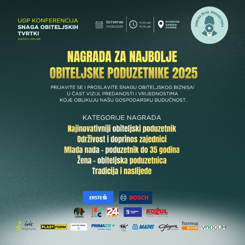 U četvrtak, 15. svibnja 2025., u Zagrebu će se održati druga konferencija posvećena isključivo obiteljskom poduzetništvu – Snaga obiteljskih tvrtki – prilike i izazovi. Organizator je Udruga Glas poduzetnika (UGP), a cilj je otvoriti dijalog o ulozi obiteljskih tvrtki kao ključnom, a često zanemarenom dijelu hrvatskoga gospodarstva.